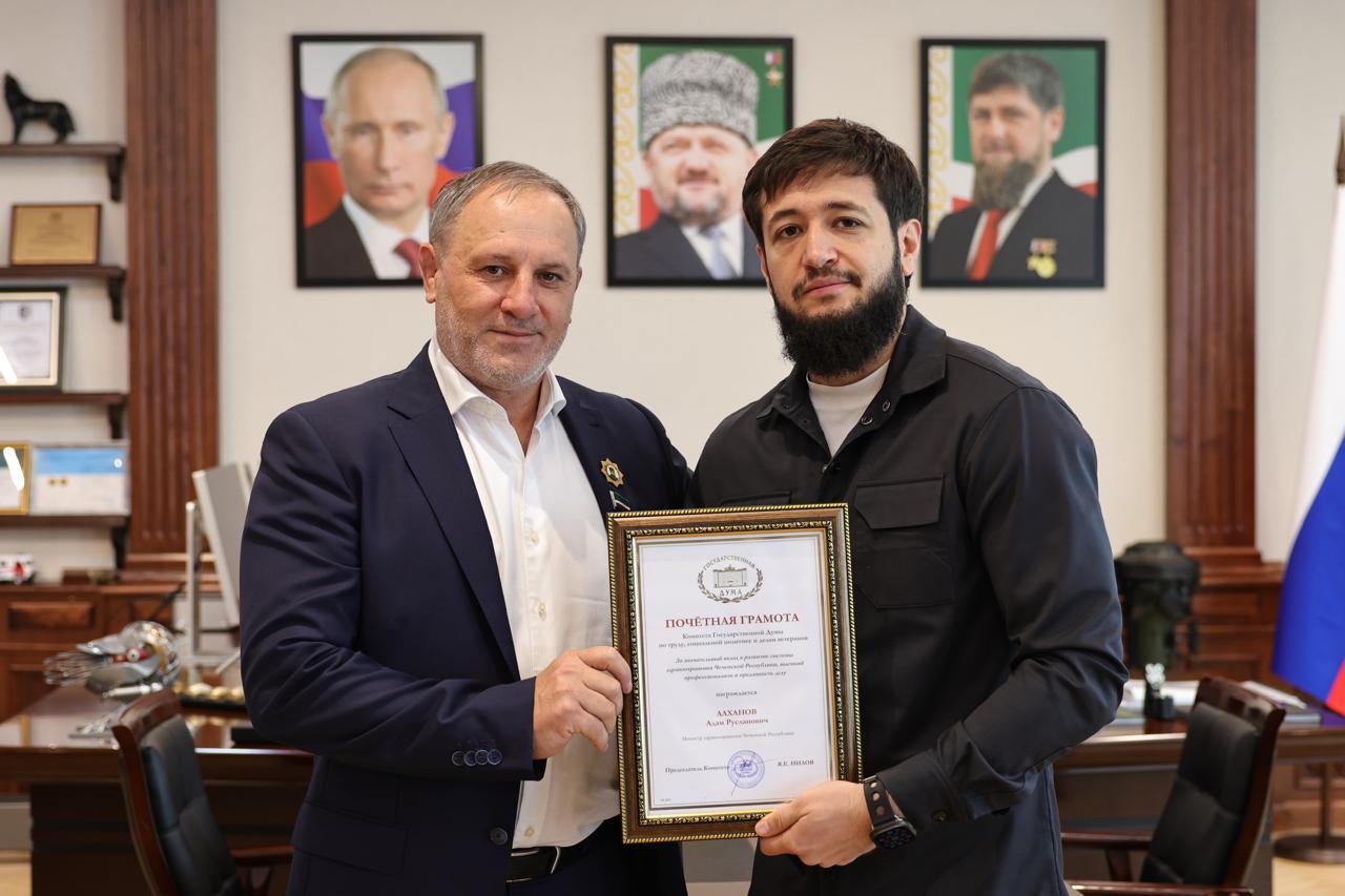 В завершение встречи Адаму Алханову вручили Почётную грамоту Комитета Госдумы по труду, социальной политике и делам ветеранов за значительный вклад в развитие здравоохранения Чеченской Республики, высокий профессионализм и преданность делу.