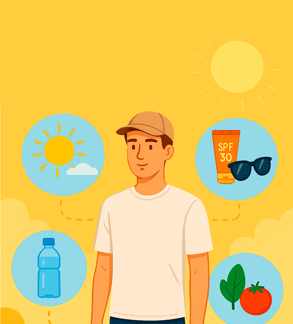 Используйте солнцезащитный крем с SPF 30 и выше — обновляйте каждые 2 часа. Не забывайте про очки с UV-защитой. Прохладный душ несколько раз в день поможет снизить температуру тела.